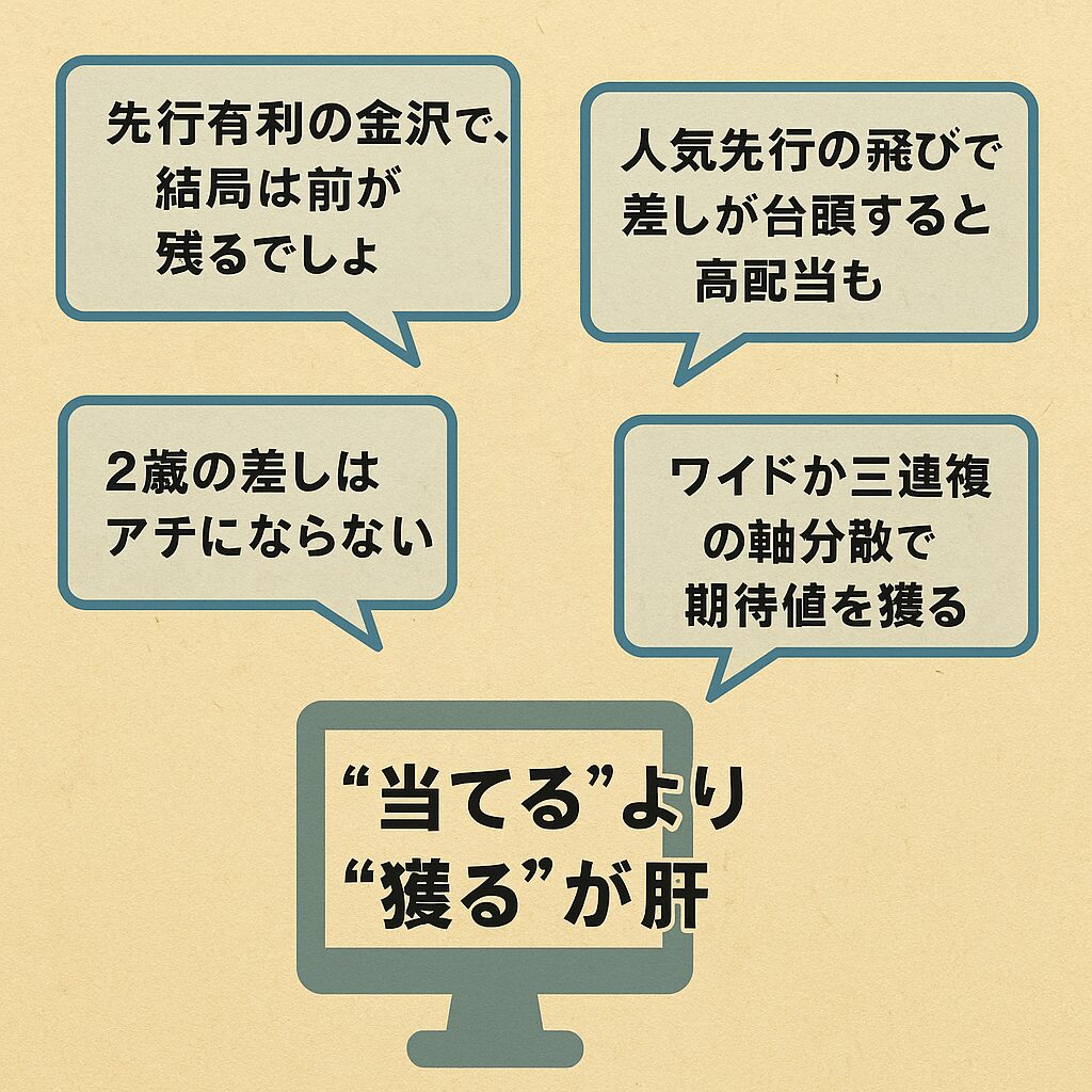 - 肯定派:「金沢は小回りだから前残りが基本」「軸は先行馬で固い」
