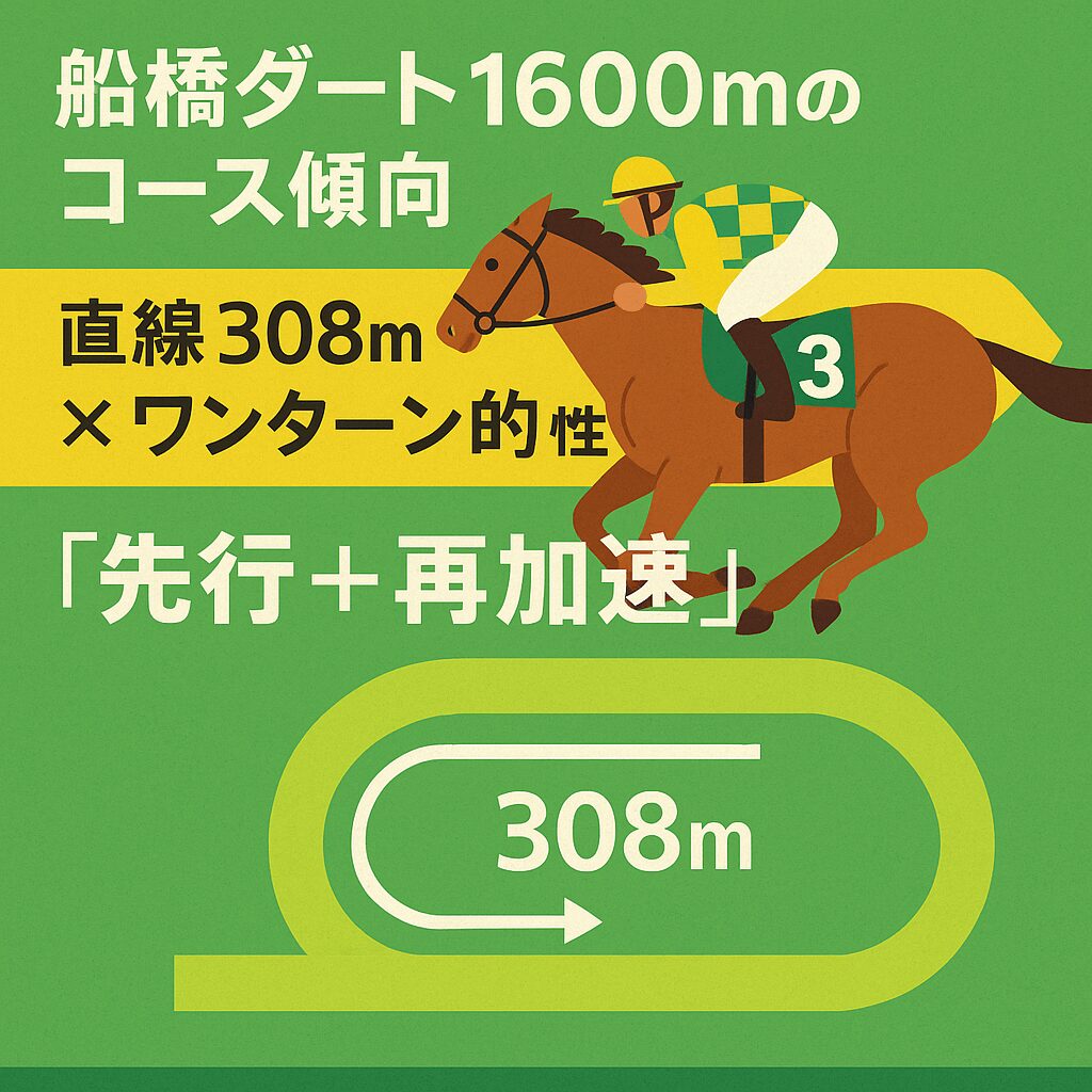 - 舞台は船橋ダ1600m想定。先行力・コーナーワーク・長い直線での再加速が問われる。