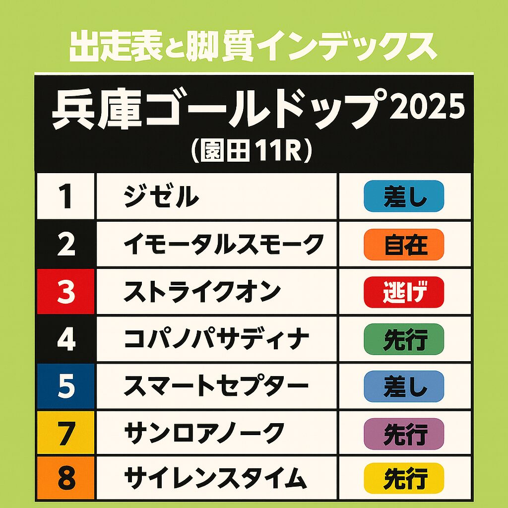 ここでは「第9回 兵庫ゴールドカップ2025」の出走馬を一覧化し、脚質・指数・妙味を比較できるように整理しました。