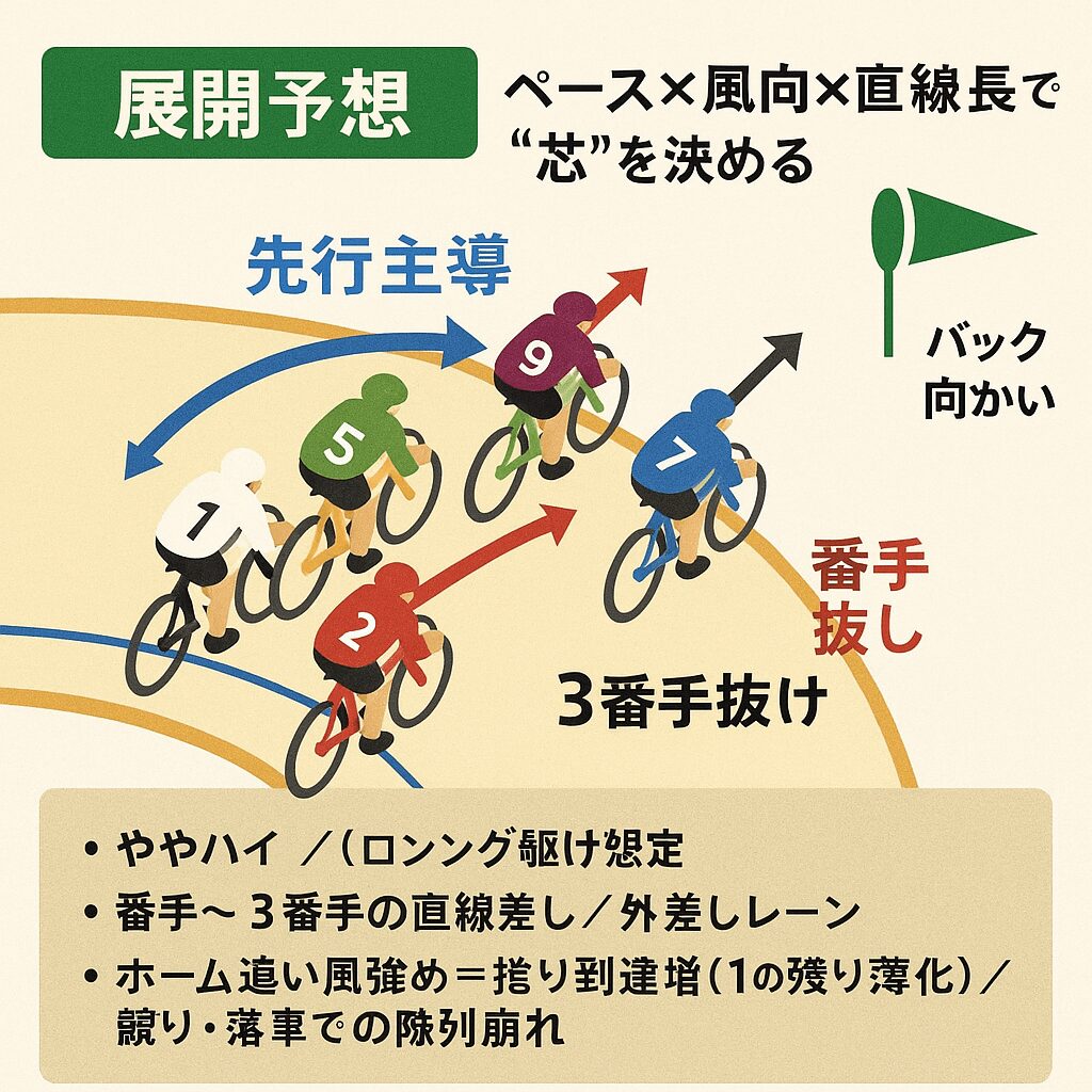 - 「風が読めれば当たりやすい。バック向かい=先行、ホーム追い=捲り到達、の教科書通りでOK。」
