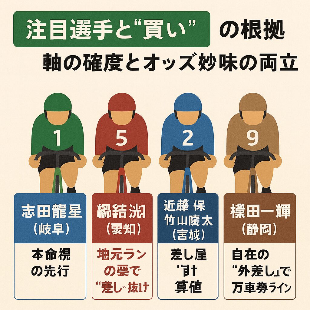 主導権争いが1志田と地元5纐纈に集中することで、ライン決着+ズレの同時成立が見込まれます。