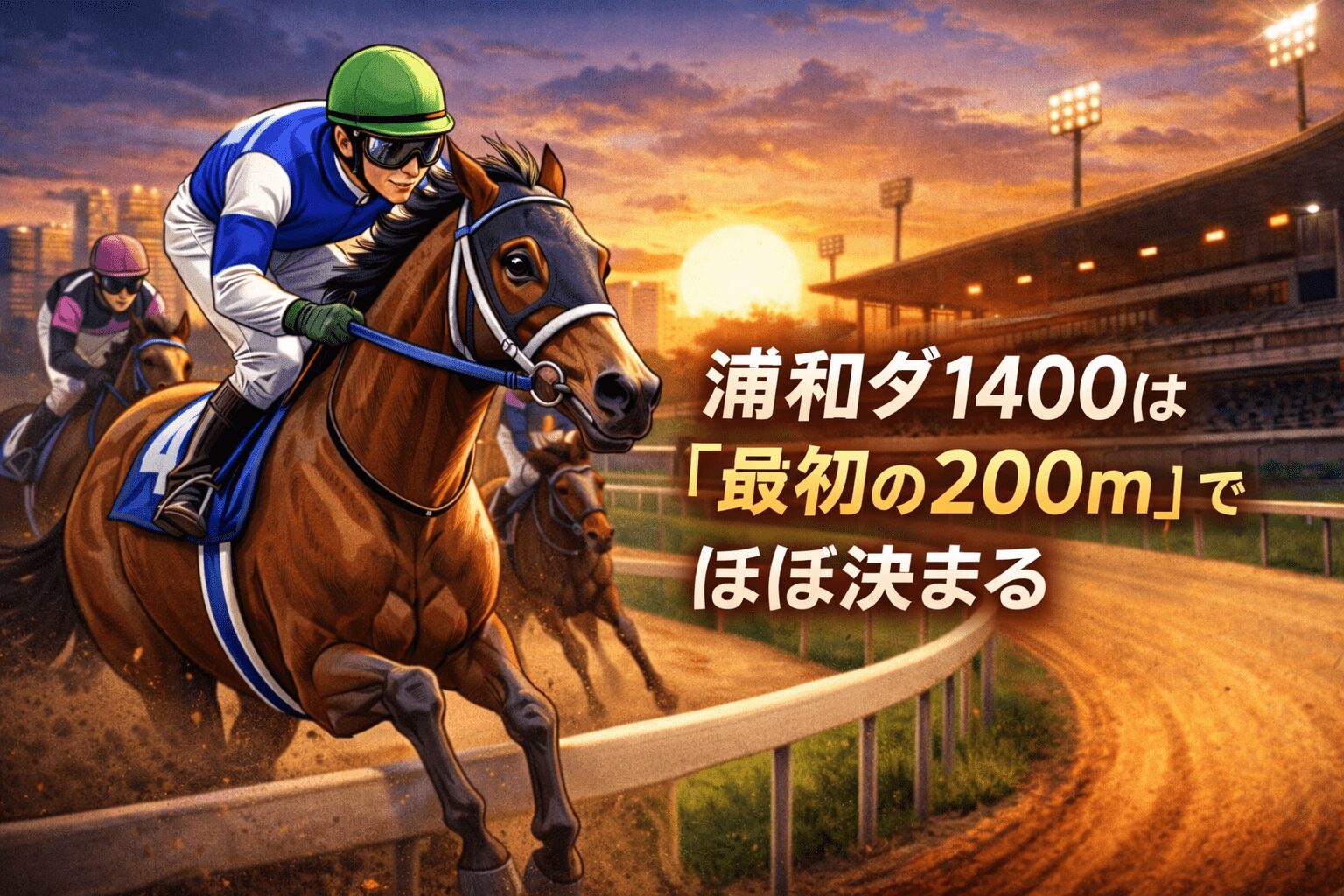 浦和競馬場のダート1400mは、地方競馬の中でも特にコース特性がはっきりしています。1周距離が短く、直線は約220mとかなりコンパクト。そのため、向正面でじっくり構える余裕はなく、スタート直後から最初のコーナーまでの数百メートルで「隊列の大枠」がほぼ決まります。ここで後手を踏むと、直線で挽回するのは容易ではありません。
