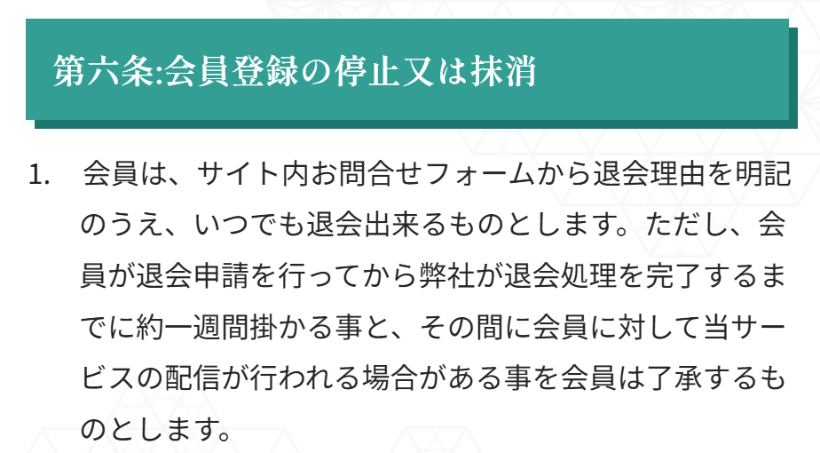 とはいえ、利用規約内に退会に関する明確なルールが記載されており、最低限の手続きは整っています。